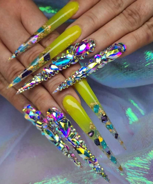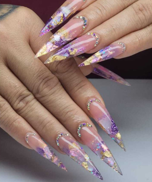 Nails with embedded designs or art sealed within the nail for glassy finish.