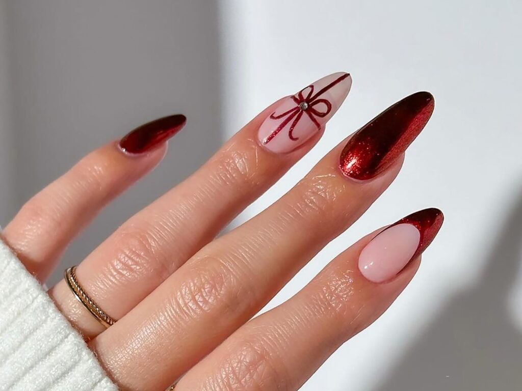This holiday season is all about shine. Chrome nails continue to dominate, especially in gold, silver, rose gold, red, and emerald chrome.